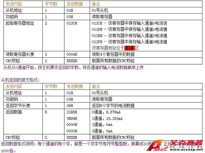 例如:485總線上掛接了一個型號為420MA-IN4型的從機,ID為01H,共4個電流輸入通道,讀取所有4個通道電流數(shù)據(jù)。