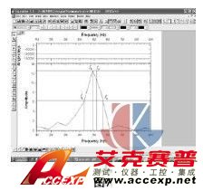 打開菜單欄Analysis下拉式菜單,選中FFT選項,對圖6所示的脈沖反射波形進行傅立葉變換。根據(jù)被測探頭的頻率標稱值,在頻譜圖橫坐標中選取相應的頻率范圍值(這一范圍值通常為0MHz到被測探頭頻率標稱值的2倍),這樣就得到了理想的脈沖反射頻譜圖。在脈沖反射頻譜圖上,把脈沖反射響應曲線上的頻率峰值點下降6dB處(頻率響應曲線的峰值點下降一半處)的fL和fH值定義為帶寬的低值和高值,兩者之間的算術(shù)平均值即為被測探頭的回波頻率,見圖7。