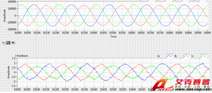 通過(guò)在實(shí)時(shí)仿真系統(tǒng)中設(shè)置不對(duì)稱(chēng)故障從而在風(fēng)電機(jī)組接入點(diǎn)處產(chǎn)生不對(duì)稱(chēng)電壓,來(lái)觀(guān)察風(fēng)電機(jī)組的運(yùn)行情況。下圖分別是實(shí)際風(fēng)電機(jī)組電壓接入點(diǎn)處的三相電壓和電流的波形圖:可以明顯看到有一相電壓幅值明顯低于其他兩相電壓。采樣的反饋電流也是三相不對(duì)稱(chēng),試驗(yàn)表明雙饋發(fā)電機(jī)組在三相不對(duì)稱(chēng)電壓下仍然能正常工作。