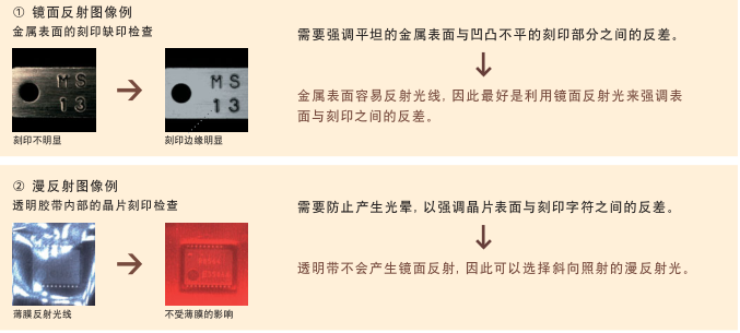 在選擇了鏡面反射、漫反射或透射等照明方式后,根據(jù)檢查目的、背景、周?chē)h(huán)境等確定照明類(lèi)型。一般說(shuō)來(lái),鏡面反射可選擇同軸入射照明、環(huán)形照明或棒型照明,漫反射可選擇低角度照明、環(huán)形照明