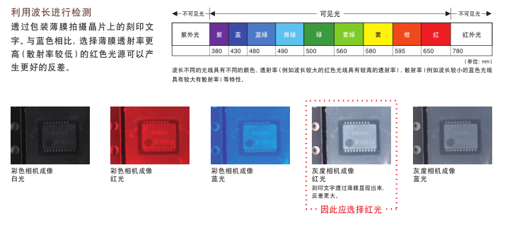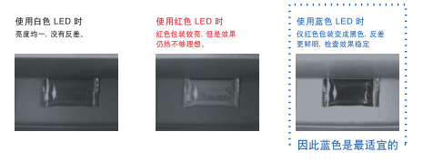最后根據(jù)工件及背景來(lái)選擇光源顏色。使用彩色照相機(jī)時(shí)一般會(huì)使用白光。如果使用黑白照相機(jī),則需要掌握下面介紹的知識(shí)。利用補(bǔ)色進(jìn)行檢測(cè)為了檢測(cè)紙箱中是否有紅色包裝的點(diǎn)心,分別使用了白色、紅色及黑色的 LED 光源。下圖所示為三種光源造成的對(duì)比度差異