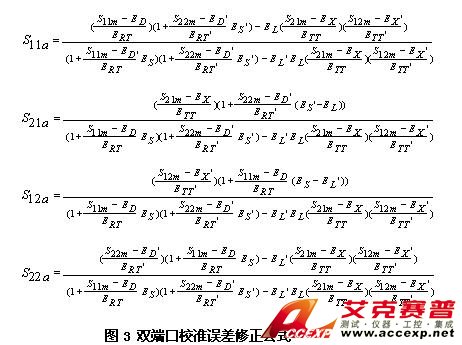 以上12項系統誤差,通過雙端口校準可以獲得。校準后,對被測件進行測量,測量過程得到四個測量S參數S11m,S21m,S12m和S22m。基于圖3所示的四個雙端口誤差修正公式,消除12項系統誤差,最終計算出實際需要的被測件的四個S參數S11a,S21a,S12a和S22a。