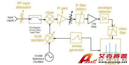 為了瞭解頻譜分析儀的運作塬理,我們需剖析其內部硬體結構。圖一顯示傳統的掃描調諧分析儀的主要組成元件。本文稍后我們將看到,現代訊號分析儀已將其中的類比硬體元件,全面更換為數位電路,特別是中頻與基頻部分。雖然如此,檢視下面的方塊圖,有助于快速瞭解分析儀的基本運作塬理。