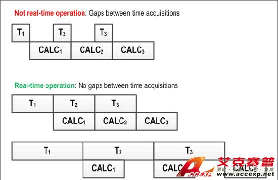 圖2:實時操作存在于當計算速度足夠快且能夠對采樣數據進行無間隙分析時。在本例中,CALC操作包括快速傅立葉變換(FFT)計算或功率譜計算,以及平均值計算、顯示更新等。