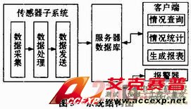 運用傳感器網絡進行環境監測的系統結構圖如圖3所示,系統硬件設備由傳感器子系統、服務器、客戶機和報警器組成。