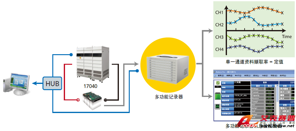 17040系統(tǒng)透過軟體可整合多功能記錄器,在充放電過程中,讀取多組的電壓與溫度紀(jì)錄,其條件可轉(zhuǎn)成保護(hù)啟動條件或截止條件。多功能記錄器可達(dá)到各通道同步取樣,最快的資料擷取速度為10ms,17040系統(tǒng)則最多可支援多功能記錄器達(dá)120通道。