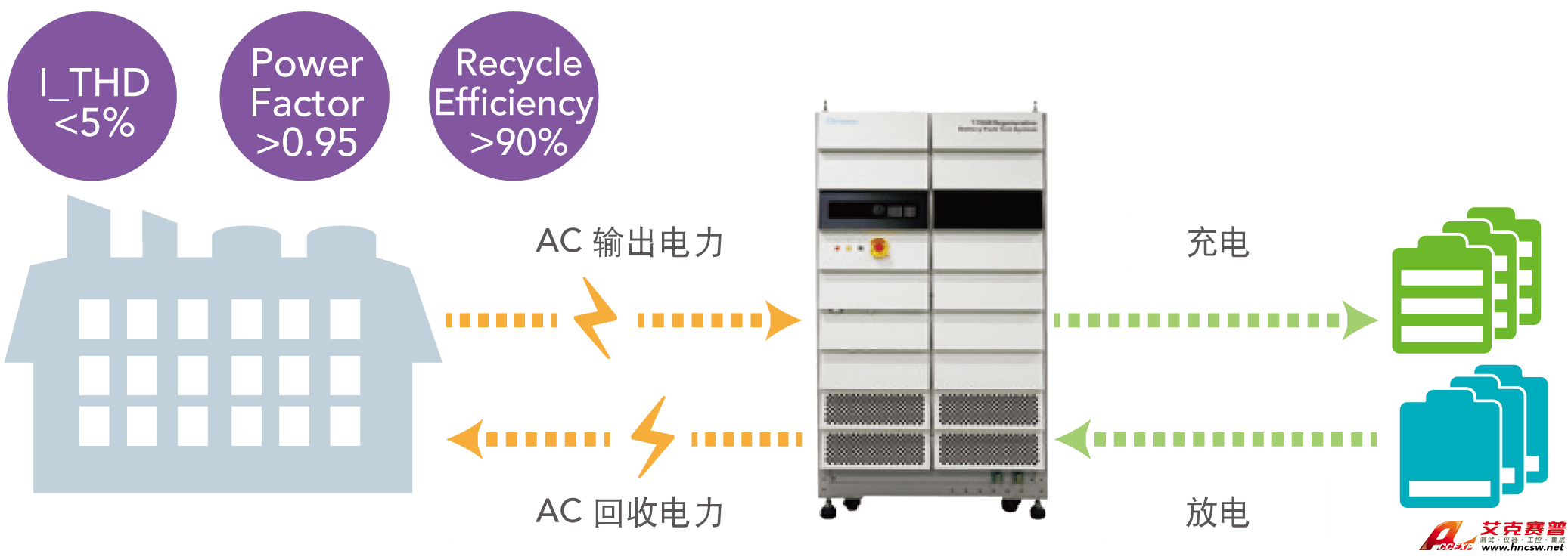 艾克賽普 能源回收式電池模組測試系統(tǒng)解決方案17040是專為高功率二次電池組測試而開發(fā)的高精密充放電設(shè)備,具有能源回收功能,可節(jié)省放電過程所消耗的大量電能,即使動態(tài)充放電,也能確保電網(wǎng)端維持穩(wěn)定,不致因諧波污染影響其他設(shè)備。并將電池組放電產(chǎn)生的電能回收到電網(wǎng)再利用,解決傳統(tǒng)的設(shè)備放電能量虛耗,以及空間熱處理不易的問題,符合環(huán)保需求。
