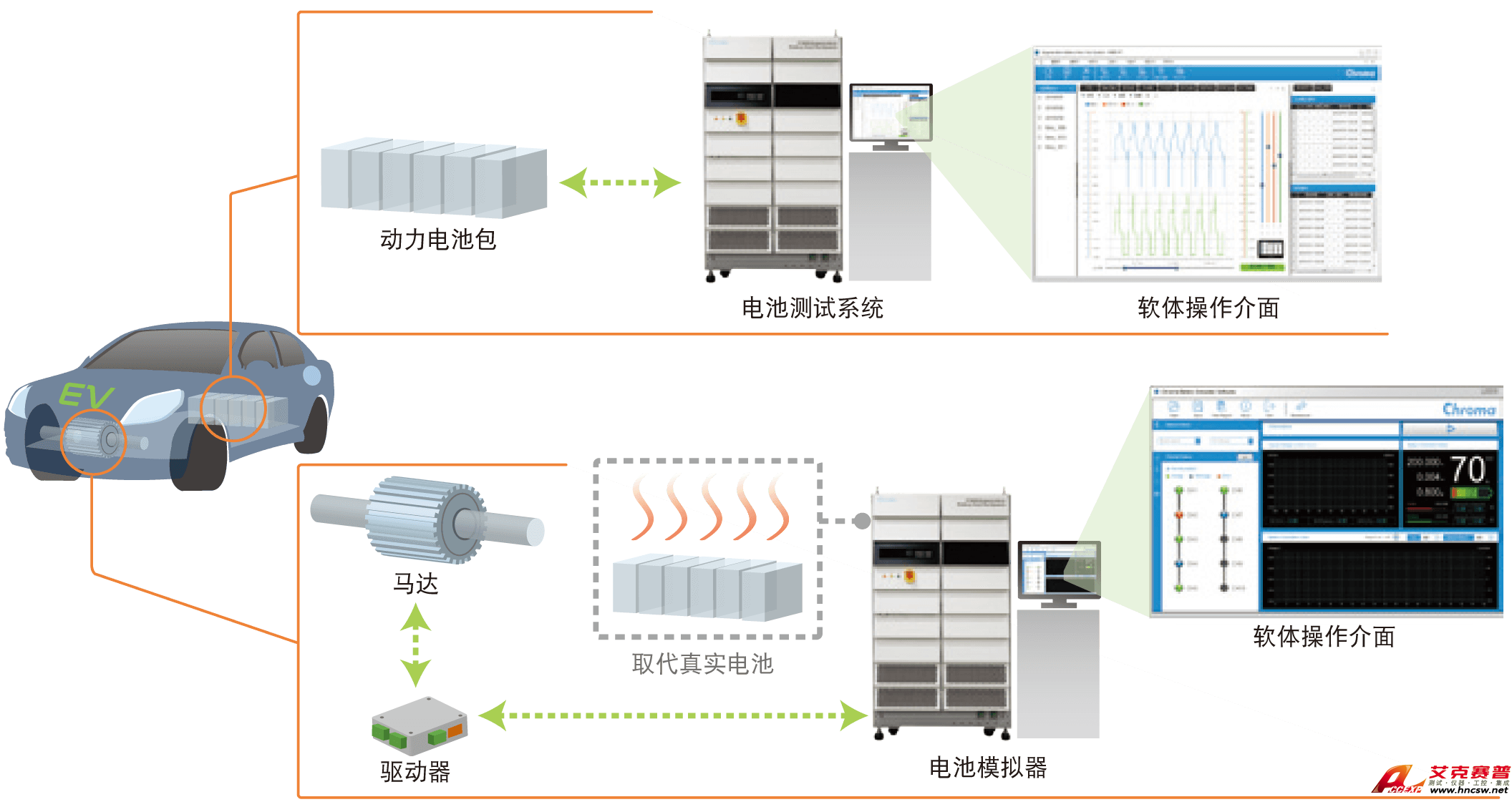 艾克賽普 能源回收式電池模組測試系統(tǒng)解決方案17040具備信道并聯(lián)與動態(tài)工況仿真功能,并聯(lián)功能可提升最大充放電電流和功率,增加設(shè)備使用上的效益與彈性,可達(dá)到設(shè)備高利用率。動態(tài)工況仿真功能可讓用戶加載行車路譜的電池波形,可選擇電流或功率兩種模式來適用不同標(biāo)準(zhǔn)(NEDC/FUDS)的要求。雙向架構(gòu)可確保充放電轉(zhuǎn)態(tài)瞬間電流不會中斷,才可精確模擬出行車工況,并能符合ISO、IEC、UL、GB/T 等各式國際測試標(biāo)準(zhǔn)。