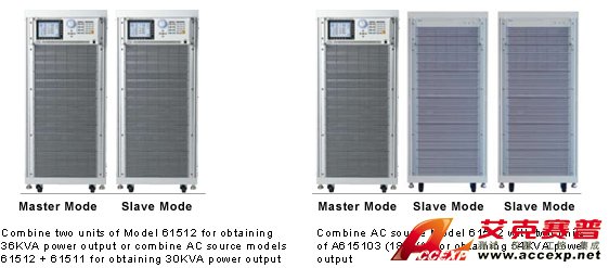 中茂 Chroma 61600 可編程交流電源本身具有每次開機時,均會做自我診斷測試,而且具備有完善的保護功能,包括有:過功率 (OP),過電流(OC),過電壓(OV)和過溫度(OT)保護,保證其品質與可信賴度,提供給要求嚴苛的工程師們測試和自動測試系統的應用。61511/61512/61611/61612交流供應器可經由(Master-Slave)并聯輸出模式以達成使用者對于高功率的需求。例如:連接5臺18KVA交流供應器在并聯模式下可實現90KVA的輸出功率。使用者還可利用專為并聯模式所開發的18KVA并聯專用機為有效替代slave單機的解決方案。請參考以下為61511/61512/61611/61612及A615103在并聯模式下的配置圖。