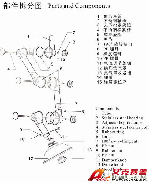 ●關(guān)節(jié)松緊旋鈕:高密度PP材質(zhì),內(nèi)嵌不銹鋼軸承,與關(guān)節(jié)連接桿鎖合