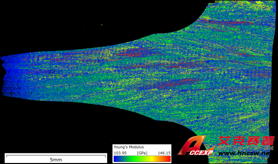 該面分布圖顯示了來自大型力學(xué)測試的Ti64合金樣品的EBSD數(shù)據(jù),晶粒取向數(shù)據(jù)用于計算加載方向的楊氏模量