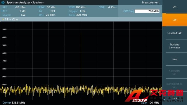 R&S FPC1500 可以在獨(dú)立模式下使用集成式信號(hào)源。由于具備這種獨(dú)特功能,R&S FPC1500 可用作連續(xù)波 (CW) 信號(hào)發(fā)生器。信號(hào)源可用作本振信號(hào)以進(jìn)行混頻器測(cè)量,或用作輸入信號(hào)以進(jìn)行放大器增益測(cè)量。