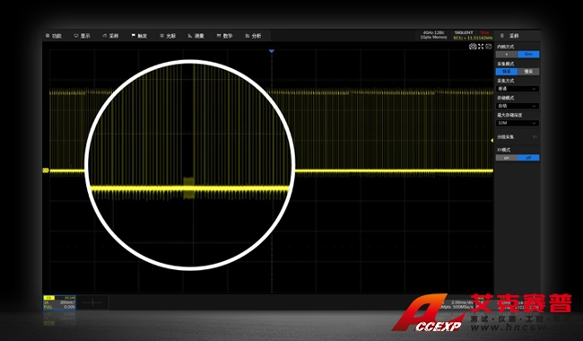 根據(jù)奈奎斯特采樣定律,為了保證采樣后的數(shù)字信號(hào)能完整復(fù)原真實(shí)信號(hào)的信息,一般實(shí)際應(yīng)用中需要保證采樣率為信號(hào)最高頻率的2.56~4倍。SDS7204A H10示波器的采樣率最高達(dá)20 GSa/s,是最高帶寬的5倍,能完美避免因采樣率不足而導(dǎo)致的信號(hào)失真。再搭配上最大1 Gpts/通道的長(zhǎng)存儲(chǔ)深度,在長(zhǎng)時(shí)間捕獲波形的同時(shí),依然能使用更高的采樣率高保真捕獲波形,充分發(fā)揮4GHz帶寬性能。