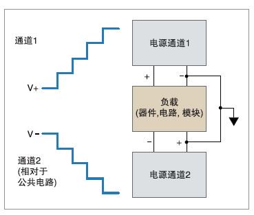 如果想為雙極模擬電路供電,可以把 Series2230G 電源的通道 1 和通道 2、 30V和60V通道連接起來,為正電路 和負電路供電。電源擁有跟蹤模式,可 以使用一個控制操作,同時改變兩臺電 源的輸出。在電壓變化時,跟蹤的兩條 通道的幅度可以一起變化,也可以按用 戶規定的比率變化。因此,可以簡便地 在指定電壓工作范圍內測試雙極電路、 模塊或器件。