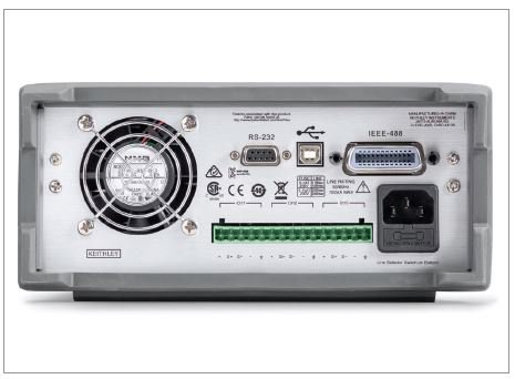 Series 2230G 電源后面板,顯示了 USB、GPIB 和 RS-232 接口和 后面輸出、來源及全部三條通道的傳感線端子塊。