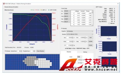 IT6000PV系列標配的多通道太陽能電池矩陣仿真軟件可以讓用戶完成不同云遮擋下的太陽能電池矩陣輸出模擬,測試并實時追蹤光伏逆變器在連接組串情境下最大功率和效能測試。根據不同的 Supplier提供多種 Module 供用戶選擇,用戶也可以自行建立PV module??梢宰远x云遮的照度及溫度參數,設定電池板串、并聯數量及動態屏蔽變化移動方向、初始化時間、總運行時間及改變移動云的時間。