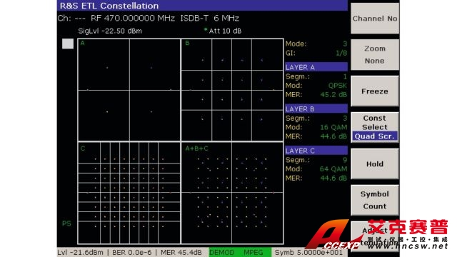 R&S ETL 電視信號(hào)分析儀是一款多合一解決方案。它在單臺(tái)儀器上集成了電視和調(diào)頻(廣播)信號(hào)分析儀、視頻分析儀、MPEG 碼流分析儀以及頻譜分析儀的功能。R&S ETL 還包含了模擬音視頻信號(hào)發(fā)生器和 MPEG-2 碼流發(fā)生器。